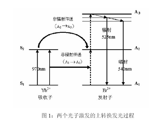 自然界中存在很多有機(jī)或無機(jī)物質(zhì),它們可以在電磁輻射激發(fā)下發(fā)射熒光或磷光,且在發(fā)光過程中遵守Stokes 規(guī)則,即發(fā)射光的波長長于激發(fā)光的波長。而在20 世紀(jì)70 年代,科學(xué)家們卻合成了一類可以反Stokes 規(guī)則產(chǎn)生磷光的特殊材料,即UCP。UCP 在紅外光區(qū)(波長>780nm)被激發(fā),卻可以發(fā)射波長遠(yuǎn)短于激發(fā)光的可見光(波長475nm-670nm),即能量上轉(zhuǎn)換。物質(zhì)構(gòu)成決定性質(zhì)特點(diǎn)。UCP 是由稀土金屬元素?fù)诫s于晶體的晶格中構(gòu)成的。在這種材料中有三種主要的成分:主基質(zhì)(Host Matrix)、吸收子(Absorber)和發(fā)射子(Emitter)。作為主基質(zhì)的晶體材料有:氧硫化物(如Y2O2S、GdO2S、La2O2S 等)、氟化物(如YF3、GdF3、LaF3 等)、鎵酸鹽(如YGaO3、Y3Ga5O12 等)以及硅酸鹽(如YSi2O5、YSi3O7 等)等;常用作吸收子的稀土金屬離子有:鐿離子(Yb3+)、鉺離子(Er3+)、釤離子(Sm3+)等;常用作發(fā)射子的稀土金屬離子有:鉺離子(Er3+)、鈥離子(Ho3+)、銩離子(Tm3+)、鋱離子(Tb3+)等。吸收子和發(fā)射子這一離子對(duì)在主基質(zhì)晶格內(nèi)適宜的空間取向和距離,是產(chǎn)生上轉(zhuǎn)換發(fā)光的基礎(chǔ)。上轉(zhuǎn)換發(fā)光的產(chǎn)生是一個(gè)涉及多個(gè)(至少兩個(gè))光子的光學(xué)過程。在這個(gè)過程中(如圖1),UCP 內(nèi)的吸收子(如Yb3+)至少要吸收兩個(gè)低能量光子(紅外光區(qū),如970nm),而后經(jīng)過一系列內(nèi)部能量轉(zhuǎn)換,以非輻射的形式(A1→A2,A2→A3)將這兩個(gè)光子的能量連續(xù)傳遞給發(fā)射子(如Er3+),以使其處于激發(fā)態(tài)(A3)。后者接著發(fā)生一個(gè)返回基態(tài)能級(jí)的躍遷,釋放一個(gè)高能光子(可見光區(qū),如525nm 或540nm),完成能量上轉(zhuǎn)換。